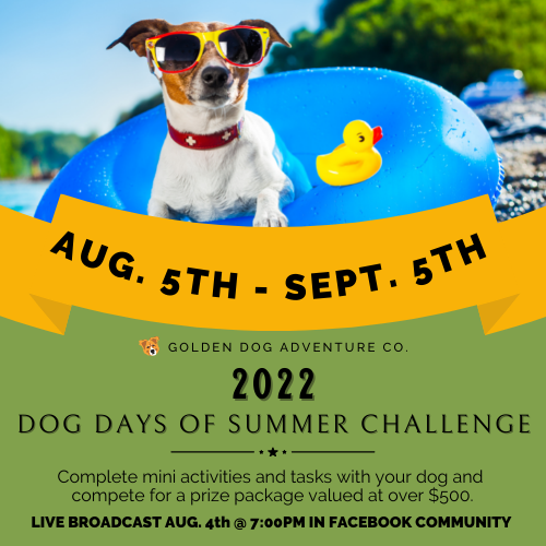Join Golden Dog Adventure Co. for their 1st Annual Dog Days of Summer Challenge for a chance to win a prize package valued at over $500! Simply having fun this summer with your dog could win you a prize package filled with gift certificates, treats, apparel, and other prizes.